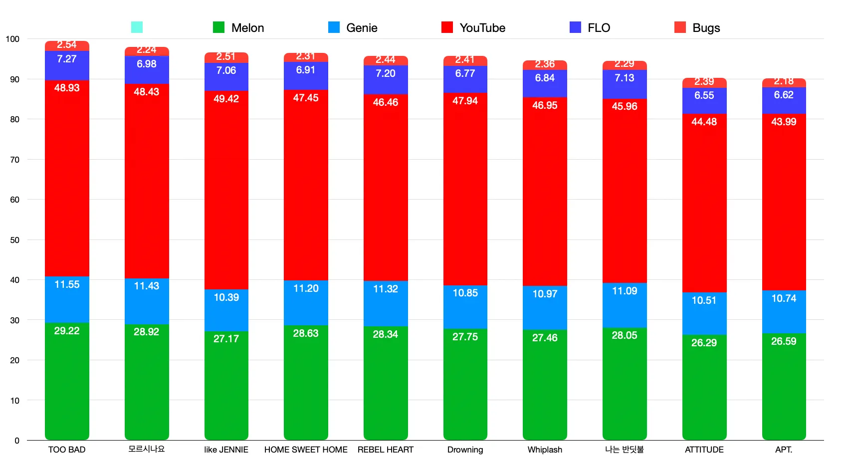 루핀 차트 Ver.2은 주요 스트리밍 플랫폼의 시장 점유율을 기반으로 점수를 책정합니다. 이전에 비해 두 플랫폼(플로, 벅스)를 추가했습니다. 앞으로 더 공정하고 객관적인 차트를 위해 지속해서 수정해나가겠습니다.