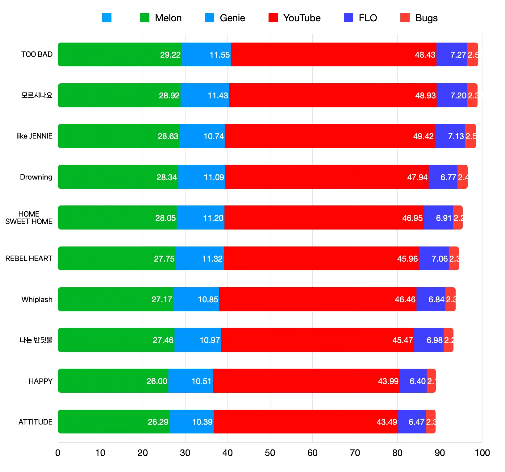 루핀 차트 Ver.2은 주요 스트리밍 플랫폼의 시장 점유율을 기반으로 점수를 책정합니다. 이전에 비해 두 플랫폼(플로, 벅스)를 추가했습니다. 앞으로 더 공정하고 객관적인 차트를 위해 지속해서 수정해나가겠습니다.